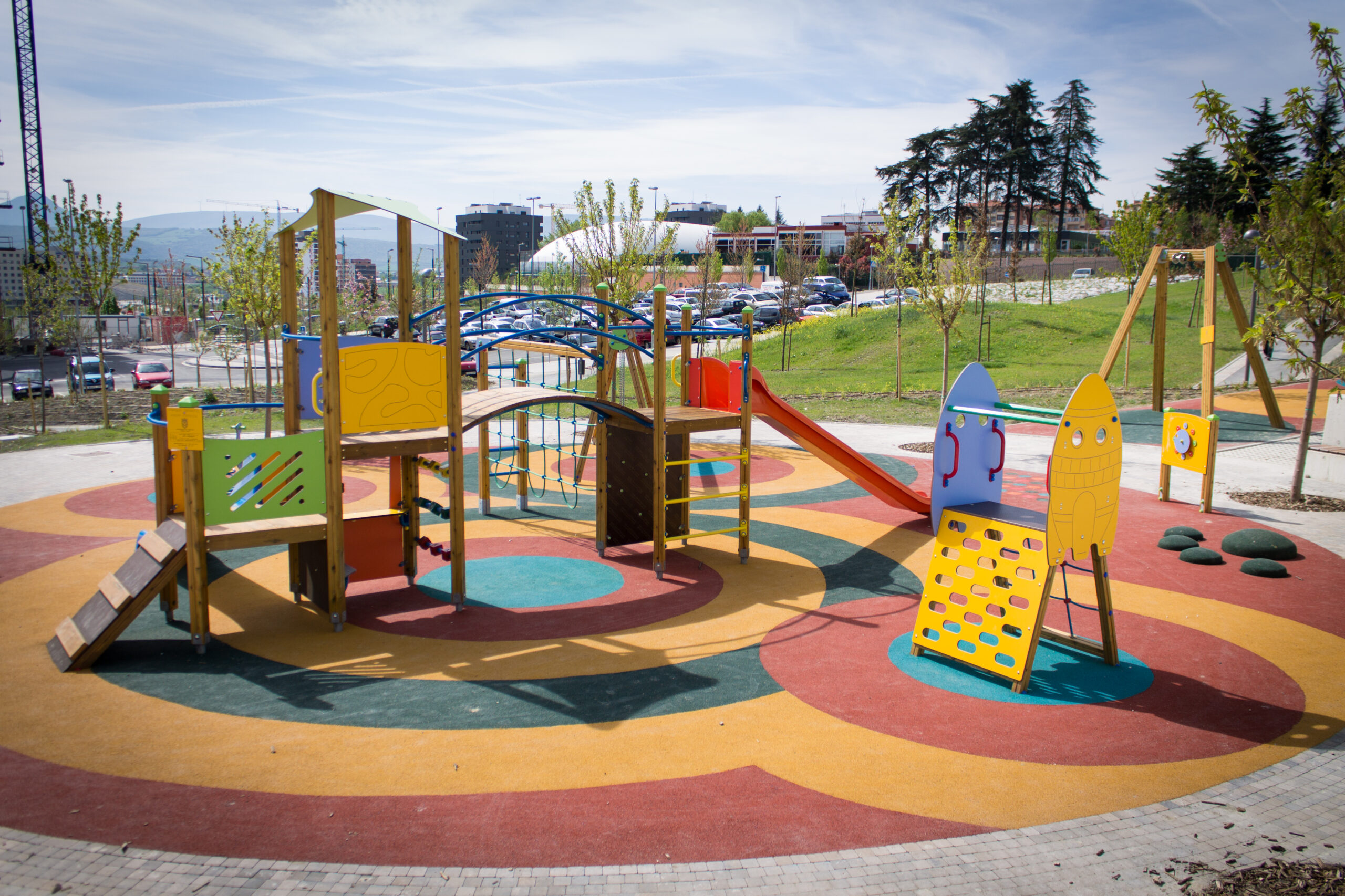 Structure de jeux compacte pour enfants de 3 à 12 ans, idéale pour les aires de jeux urbaines.