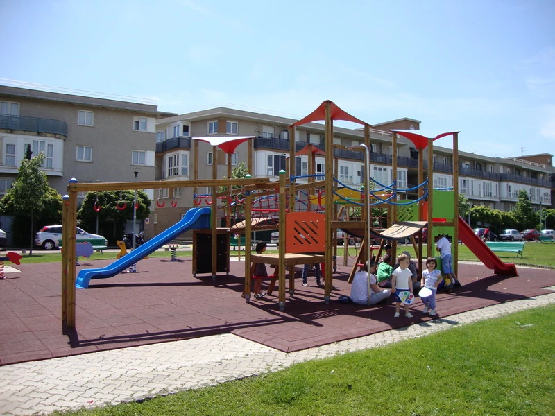 Structure de jeux compacte pour enfants de 3 à 12 ans, idéale pour les petites aires de jeux urbaines.