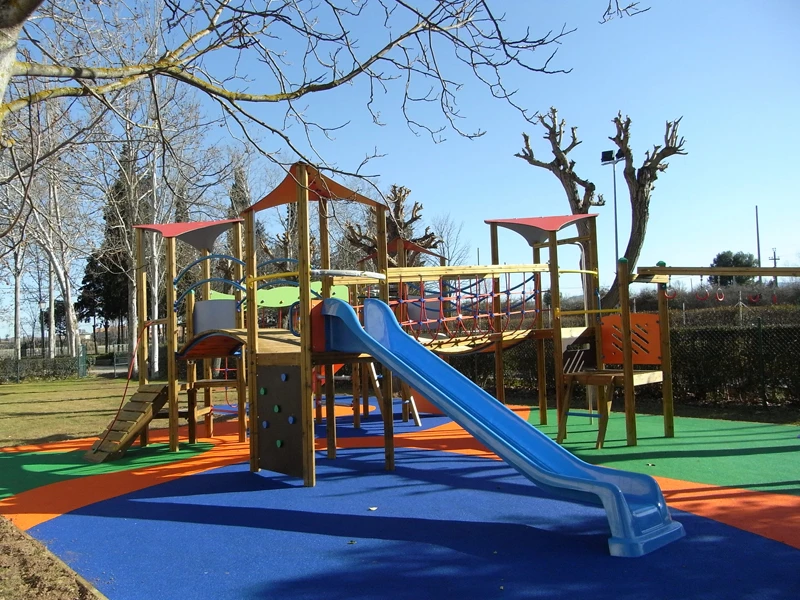 Les éléments métalliques (supports, poteaux, barres de grimpe et structures) sont réalisés en acier galvanisé à chaud, garantissant une protection élevée contre la corrosion. Ils sont ensuite revêtus d’une peinture thermolaquée cuite au four, offrant une excellente résistance aux intempéries, à l’usure et aux agressions extérieures.
