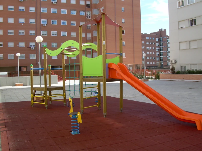 Structure de jeux compacte pour enfants de 3 à 12 ans, idéale pour les aires de jeux urbaines.
