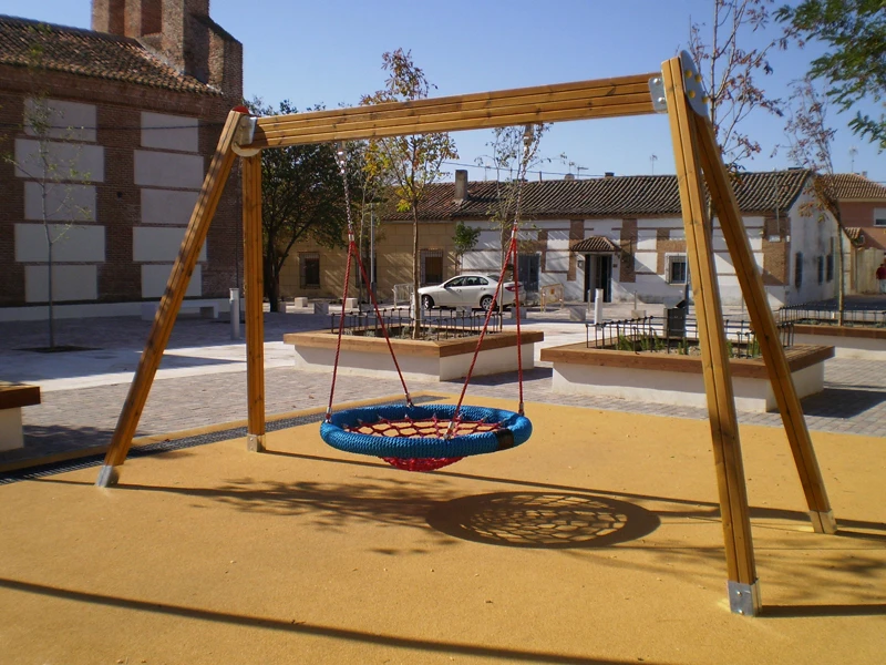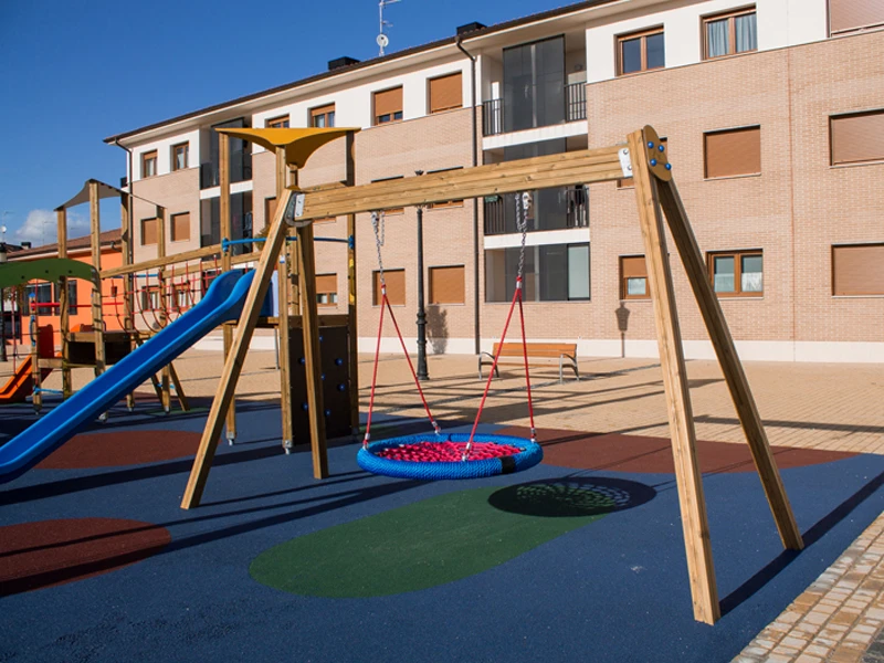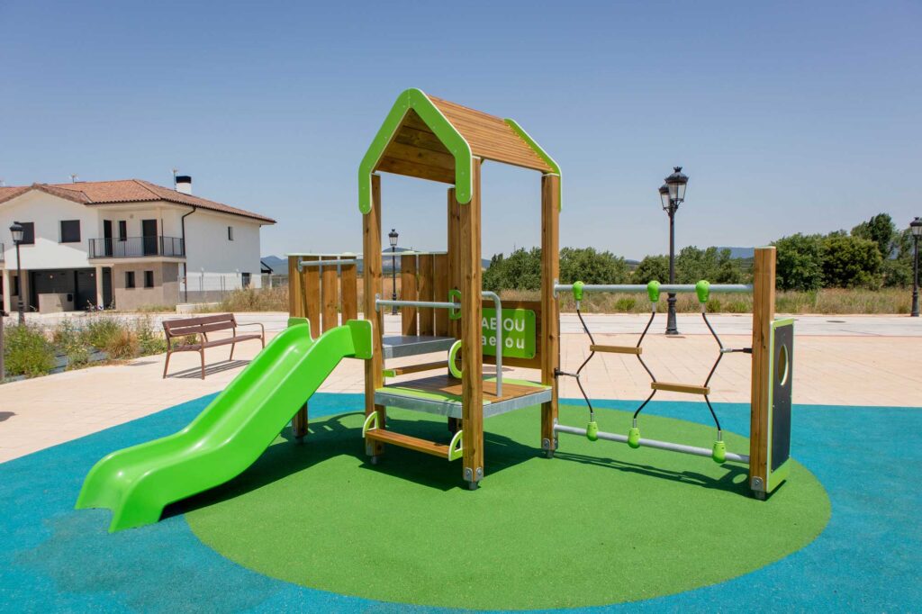 Les éléments métalliques (supports, poteaux, barres de grimpe et structures) sont réalisés en acier galvanisé à chaud, garantissant une protection élevée contre la corrosion. Ils sont ensuite revêtus d’une peinture thermolaquée cuite au four, offrant une excellente résistance aux intempéries, à l’usure et aux agressions extérieures.