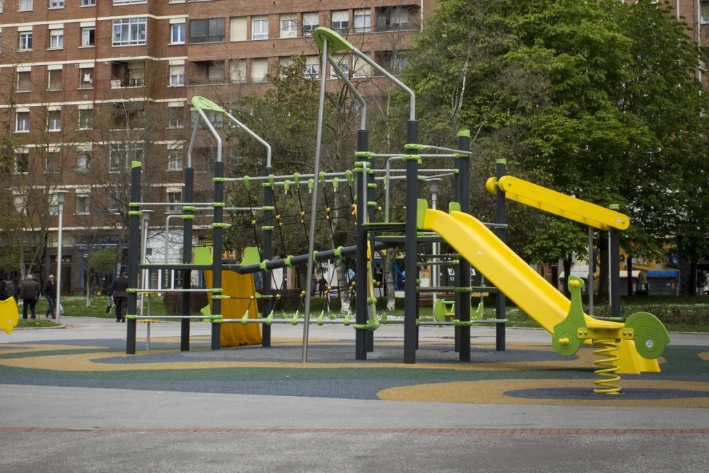 Structure de jeux compacte pour enfants de 3 à 12 ans, idéale pour les aires de jeux urbaines.